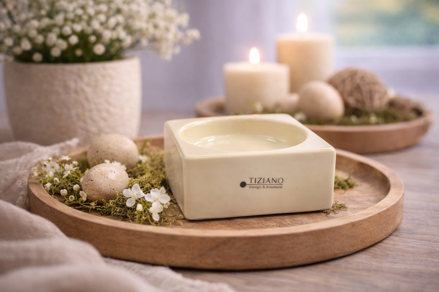 Der Tiziano Kerzenhalter Mantova in elegantem Creme besticht durch sein zeitloses, quadratisches Design und hochwertige Verarbeitung. Ideal für Teelichter oder stilvolle Dekorationen im Wohn- und Essbereich.